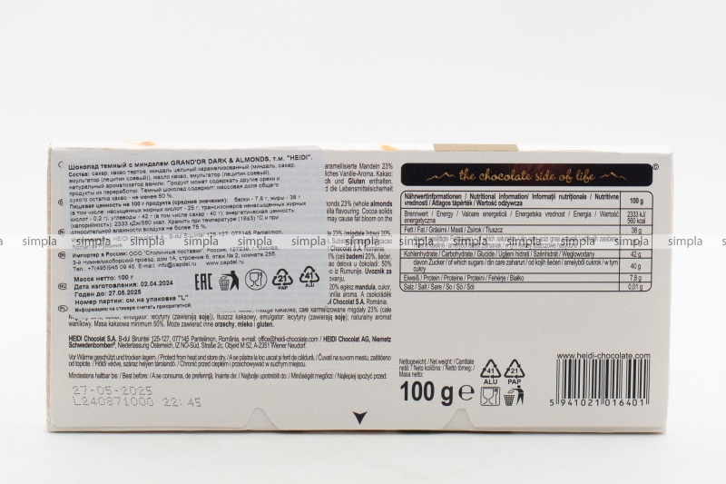 В нашем интернет-магазине Вы можете купить "Шоколад HEIDI Chocolat S.A. GRAND'OR DARK & ALMONDS (Темный с миндалем) 100гр" по низкой оптовой цене с быстрой и удобной доставкой в г.Мурманск (Мурманская область). Мы предлагаем широкий ассортимент импортных сладостей и напитков от проверенных поставщиков и реализуем продукцию во всех регионах РФ.